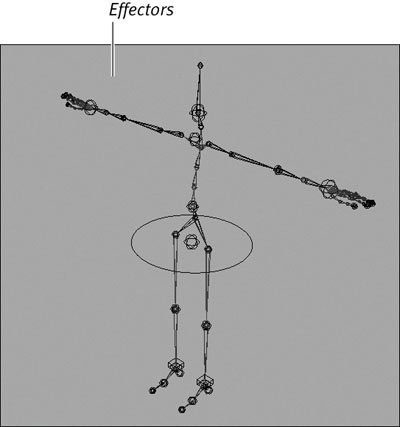 Figure 10.81. The effectors appear on your model in the appropriate spots. Take a moment to double-check that all the effectors you wanted were added, and that they are in the correct places.  | | | 4. | Select a hand effector, and set Pinning to unpinned in the Channel Box (Figure 10.82).