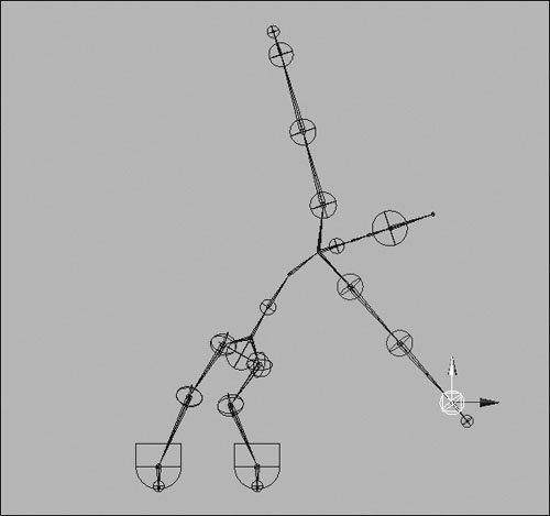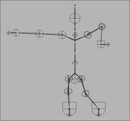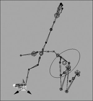 Figure 10.65. In conjunction with the spine, the foot rig now allows independent placement of the hips, knee, ankle, and toe, as well as quick placement of the foot and leg wherever needed. | About Full Body IK Full Body IK, a new feature in Maya 7.0, is a character rig designed for bipeds and quadrupeds. Full Body IK (FBIK) utilizes pinnable IK handles and a fully interconnected skeleton (Figure 10.66) that makes posing your character quick and easy. Additionally, FBIK automatically adds the complicated set of constraints and connections to your skeleton, saving you from doing it yourself. Figure 10.66. The FBIK skeleton and its accompanying effectors. The circles and boxes around the joints can be used to pin parts of the model in place while posing.  Whereas a normal IK solver only affects a portion of the body, the IK rig of FBIK is entirely interconnected. If you over-extend an IK control, the body adjusts itself to ensure an accurate pose. If you want your character to pick something up, you can drag the hand down to the ground, and the skeleton will bend at the waist and knees to ensure the hand reaches(Figure 10.67). Figure 10.67. FBIK can be a powerful animation tool, giving you quick and precise control over your character.  Maya provides a built-in FBIK skeleton that you can use to explore the way FBIK works. To import an example FBIK rig: 1. | Choose Skeleton > Full Body IK > Get FBIK example.