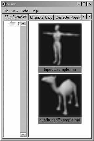 Figure 10.68. The Visor contains a prerigged biped and quadruped skeleton.  | 2. | With the middle mouse button, drag the example you want into your view.