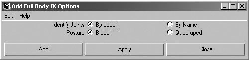 Figure 10.80. Set the options you wish to use.  Maya adds the constraints and effectors to your skeleton automatically. Your character is now rigged (Figure 10.81)!
