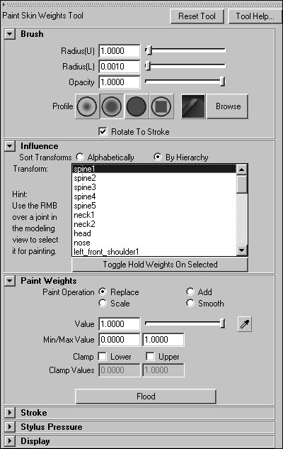 Figure 11.40. Unlike some Maya tools, the Paint Skin Weights tool's settings are vital to its use.  | 3. | If it isn't already selected, choose Smooth Shade All from your view's Shading menu.