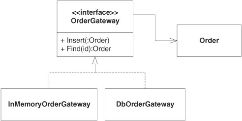 | PROXY is a difficult pattern to use and is overkill for most applications. I would not use it unless convinced that I needed absolute separation between the business rules and the database schema. Normally, the kind of absolute separation afforded by PROXY is not necessary, and some coupling between the business rules and the schema can be tolerated. TABLE DATA GATEWAY (TDG) is a pattern that usually achieves sufficient separation, without the cost of PROXY. Also known as data access object (DAO), this pattern uses a specialized FACADE for each type of object we wish to store in the database (see Figure 34-9). Figure 34-9. TABLE DATA GATEWAY pattern  OrderGateway (Listing 34-24) is an interface that the application uses to access the persistence layer for Order objects. This interface has the method Insert for persisting new Orders and a method Find for retrieving already persisted Orders. DbOrderGateway (Listing 34-25) implements the OrderGateway and moves Order instances between the object model and the relational database. It has a connection to an SqlServer instance and uses the same schema used previously in the PROXY example.[1] [1] I have to say that I hate the database access systems in today's major platforms. The idea of building up SQL strings and executing them is messy at best and certainly baroque. It's a shame that we have to write programs to generate SQL which was meant to be read and written by humans but that instead is parsed and interpreted by the database engine. A more direct mechanism could (and should) be found. Many teams use persistence frameworks, such as NHibernate, to hide the worst of the arcane SQL manipulations, and this is a good thing. However, these frameworks merely hide what ought to be eliminated. Listing 34-24. OrderGateway.cs public interface OrderGateway { void Insert(Order order); Order Find(int id); } | Listing 34-25. DbOrderGateway.cs public class DbOrderGateway : OrderGateway { private readonly ProductGateway productGateway; private readonly SqlConnection connection; public DbOrderGateway(SqlConnection connection, ProductGateway productGateway) { this.connection = connection; this.productGateway = productGateway; } public void Insert(Order order) { string sql = "insert into Orders (cusId) values (@cusId)" + "; select scope_identity()"; SqlCommand command = new SqlCommand(sql, connection); command.Parameters.Add("@cusId", order.CustomerId); int id = Convert.ToInt32(command.ExecuteScalar()); order.Id = id; InsertItems(order); } public Order Find(int id) { string sql = "select * from Orders where orderId = @id"; SqlCommand command = new SqlCommand(sql, connection); command.Parameters.Add("@id", id); IDataReader reader = command.ExecuteReader(); Order order = null; if(reader.Read()) { string customerId = reader["cusId"].ToString(); order = new Order(customerId); order.Id = id; } reader.Close(); if(order != null) LoadItems(order); return order; } private void LoadItems(Order order) { string sql = "select * from Items where orderId = @orderId"; SqlCommand command = new SqlCommand(sql, connection); command.Parameters.Add("@orderId", order.Id); IDataReader reader = command.ExecuteReader(); while(reader.Read()) { string sku = reader["sku"].ToString(); int quantity = Convert.ToInt32(reader["quantity"]); Product product = productGateway.Find(sku); order.AddItem(product, quantity); } } private void InsertItems(Order order) { string sql = "insert into Items (orderId, quantity, sku)" + "values (@orderId, @quantity, @sku)"; foreach(Item item in order.Items) { SqlCommand command = new SqlCommand(sql, connection); command.Parameters.Add("@orderId", order.Id); command.Parameters.Add("@quantity", item.Quantity); command.Parameters.Add("@sku", item.Product.Sku); command.ExecuteNonQuery(); } } } | The other implementation of OrderGateway is InMemoryOrderGateway (Listing 34-26). InMemoryOrderGateway will save and retrieve Orders just like the DbOrderGateway, but stores the data in memory, using a Hashtable. Persisting data in memory seems rather silly, since all will be lost when the application exits. However, as we'll see later, doing so is invaluable when it comes to testing. Listing 34-26. InMemoryOrderGateway.cs public class InMemoryOrderGateway : OrderGateway { private static int nextId = 1; private Hashtable orders = new Hashtable(); public void Insert(Order order) { orders[nextId++] = order; } public Order Find(int id) { return orders[id] as Order; } } | We also have a ProductGateway interface (Listing 34-27) along with its DB implementation (Listing 34-28) and its in-memory implementation (Listing 34-29). Although we could also have a ItemGateway to acess data in our Items table, it's not neccessary. The application is not interested in Items outside the context of an Order, so the DbOrderGateway deals with both the Orders table and Items table of our schema. Listing 34-27. ProductGateway.cs public interface ProductGateway { void Insert(Product product); Product Find(string sku); } | Listing 34-28. DbProductGateway.cs public class DbProductGateway : ProductGateway { private readonly SqlConnection connection; public DbProductGateway(SqlConnection connection) { this.connection = connection; } public void Insert(Product product) { string sql = "insert into Products (sku, name, price)" + " values (@sku, @name, @price)"; SqlCommand command = new SqlCommand(sql, connection); command.Parameters.Add("@sku", product.Sku); command.Parameters.Add("@name", product.Name); command.Parameters.Add("@price", product.Price); command.ExecuteNonQuery(); } public Product Find(string sku) { string sql = "select * from Products where sku = @sku"; SqlCommand command = new SqlCommand(sql, connection); command.Parameters.Add("@sku", sku); IDataReader reader = command.ExecuteReader(); Product product = null; if(reader.Read()) { string name = reader["name"].ToString(); int price = Convert.ToInt32(reader["price"]); product = new Product(name, sku, price); } reader.Close(); return p