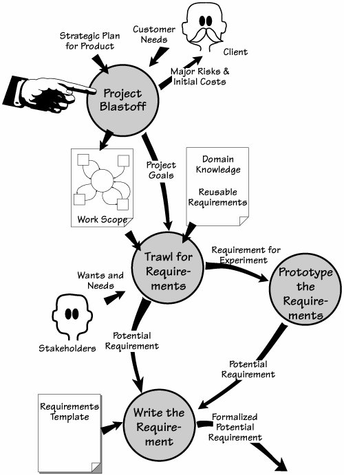 The blastoff activity assembles enough information to ensure that the project can proceed smoothly. It also verifies that the project is viable and worthwhile. Most of the outputs build the foundation for the trawling activity to come. The risks and costs are used by project management. You can find a complete model of the blastoff process in Diagram 1 in the Volere Requirements Process model in appendix A.  |