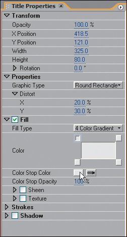 Figure 15.4. When you assign colors to a gradient, you must first click the color box for the position that you want to assign. The selected position will look like it's punched out. To assign a specific color to that position, click the Color Picker box shown here beneath the mouse. Additionally, you can assign color using the eyedropper, which allows you to pick a color from any region of the desktop. This is very helpful for picking a color that is a part of your video frame, but may be difficult to identify in the Color Picker  The Fill listing determines the coloring that fills your selected text or object. Of the several choices in the drop-down menu, I think the 4 Color Gradient offers a good method of creating a professional-looking title with more color depth.