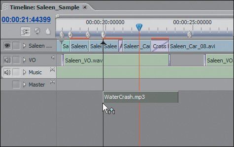 | | | 3. | Toggle the Track Output off for both the VO track and the Music track. Drag and drop the WaterCrash.mp3 file into the gray area below the audio tracks to create a new track for the clip. Position it at timeline marker 1 (Figure 20.1). Right-click in the new track's header area, and rename the track FX Smoke.