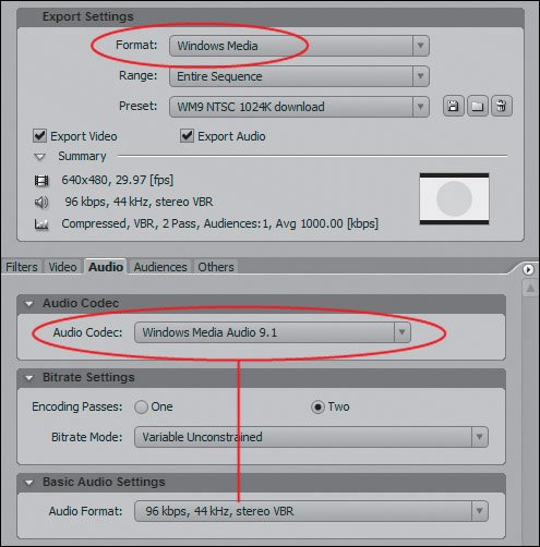 | | | 2. | In the Adobe Media Encoder, select Windows Media from the Export Settings > Format drop-down menu (see Figure 21.7). Choose the preset labeled WM9 NTSC 1024K download. Click the Audio tab, click the Audio Codec drop-down menu, and select Windows Media Audio 9.1 Professional. From the Basic Audio Settings > Audio Format drop-down menu select the preset labeled 192 kbps, 48kHz, 5.1 channel, 16 bit (A/V) CBR (see Figure 21.8).