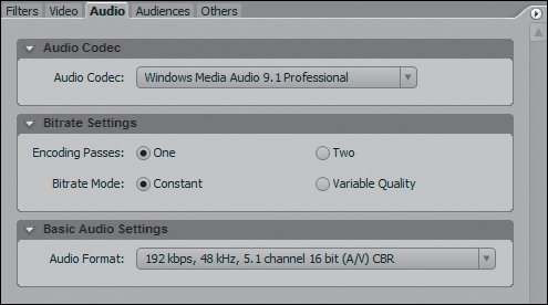 Figure 21.7. The Adobe Media Encoder is set to Windows Media. With the 1024K preset selected, you can see Audio Codec is set to Windows Media Audio 9.1. The Basic Audio Settings reveal Stereo as the Audio Format setting  Figure 21.8. With the Windows Media Audio 9.1 Professional codec selected, you can choose presets that support two, six, or eight channels of audio  Using Windows Media as your format in the Adobe Media Encoder, the Windows Media Audio 9.1 Professional Audio Codec is my preferred codec when encoding more than two channels of audio. Although the Windows Media Audio 9.1 Lossless codec supports two- and six-channel audio, the Professional audio codec gives you a ton of presets.