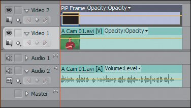 | 2. | Drag and drop the file A Cam 01.avi to the Video 1 track in PiP Sequence. Drag and drop PiP Frame to the Video 2 track, covering the clip. Extend the duration of the title to cover the entire clip beneath it (Figure 24.18). Preview the results in your Program Monitor.