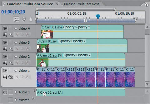 | | | 2. | Open the MultiCam Sequence in the Timeline panel, and review the stacked clips. Turning on and off the eye dropper for each video track, get acquainted with which shots are where and the green screen elements they contain (Figure 25.4). Drag and drop the Three-Way Color Corrector effect onto each of the A Cam 01, B Cam 01, and C Cam 01 clips. Finally, drag and drop the Green Screen Key effect onto the same clips (Figure 25.5).