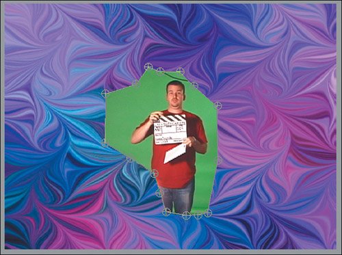 Figure 25.11. With 16 points to manipulate, you can easily crop a cluttered frame. As the image is cropped, you can see the background clip beneath it appear in the cropped area  | | | 4. | Increase your Program Monitor zoom to 150%. Select the Hand tool (H), and reposition the frame in the Program Monitor so that you can see the top of the subject's head. Press V to get back to the Selection tool, and be sure that the matte is cropping out the wire and not the top of the head (Figures 25.12a and b).