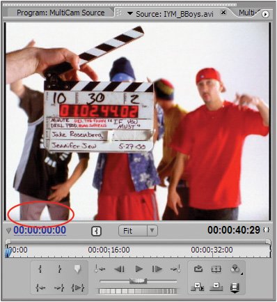 | | | 2. | Drag and drop the IYM_Master.avi file (located in Chapter 27's IYM Media subfolder on the DVD), into Video 1 of the Multi-Cam Source sequence. Double-click on the IYM_BBoys.avi file to open it in the Source Monitor. With the clip open and displaying its first frame, select File > Timecode. In the Timecode dialog, type in the exact numbers that display in the Smart Slate of the video clip (01024402) and then click OK. At first, the clip opens without timecode matching that of the Smart Slate (Figure 27.14). With the clip active in the Source Monitor, choose File > Timecode menu to bring up the Timecode dialog, enter a new timecode value to match the Smart Slate, then click OK (Figure 27.15). Premiere Pro then updates the timecode in the clip (Figure 27.16). Drag and drop the clip onto Video 2 of the Multi-Cam Source Sequence.