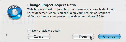 Note The 6.0 themes are designed to be widescreen. If your project is standard, and you select one of those themes, iDVD asks if you would like to change your project to widescreen. No, thank you. Click Keep.  | 6. | Scroll through the options available, looking for one that feels appropriate for Jennifer's ceramics studio.