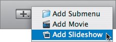 | Adding Photos and Slideshows from iPhoto While you're in iDVD, you can access your photos and entire albums in iPhoto. But before you go digging through them, you need to make a place in iDVD where your photos will go. | | 1. | Click the plus (+) button at the bottom of the window and select Add Slideshow from the drop-down menu.