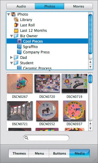 From the Media pane, you have access to your iTunes and GarageBand songs, your photos from iPhoto, and your movies in the Movies folder.