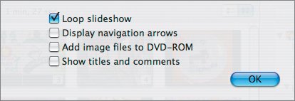 Tip The "Add image files to DVD-ROM" option lets you include a folder of the slideshow images at their best quality possible. Christopher chooses this option when he wants to distribute photos to the grandparents. They can watch the slideshow first and then, if they want, make prints from iPhoto, using the original files on the DVD. Jennifer has no need for this feature for her DVD, but it's a great option. Because this slideshow will run unassisted and in a public space, Jennifer decides to let the show loop indefinitely and to present each slide for 5 seconds, a little longer than she might ordinarily. She also likes to use dissolves as a transition between shots.
