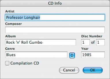 | Let's say you've finished ripping a handful of CDs and had no hitches. When iTunes automatically looked up information on the Internet about each CD you imported to your Mac, it loaded a bunch of data into a database it keeps in your iTunes Library. In most cases, you won't need to mess around here, but if the CD data doesn't come up the way you want it tobecause you don't have an Internet connection, the data doesn't exist for your CD, or you simply don't agree with some of the characterizations the CDDB database offeredyou'll need to add or adjust information. It's easy to do, and as you get more advanced with iTunes, you'll learn many interesting ways you can catalog and organize your collection. Note The Gracenote CDDB is compiled through user submissions and not from record companies. Consequently, there may be some errors or subjective opinions about data included. Adjusting Information Before Importing Let's begin by adjusting information for a CD you haven't yet imported into your computer. Follow these steps if you have a CD with "problem" information. | | 1. | Insert a new CD.