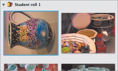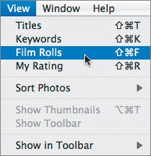 The library photos are organized in order of date and time imported. Each import is considered a film roll, kind of a quaint notion these days. To view your photos by film roll, choose View > Film Rolls. This option shows a film roll icon in the library, followed by the date of import and the roll's name (if any). The photos line up below the name of the roll.