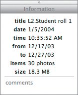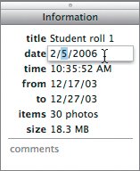 | Change Roll Information iPhoto automatically names each roll of film and dates it with the time and date of your import. Roll names come from the camera and tend to be gibberish and pretty useless. If you drag a folder in, as you just did, the roll name is the folder name, and the date is the date when the folder was created, not when it was dragged into iPhoto. Now is a good time to see how to adjust this information. | | 1. | Click the roll icon (or name).
