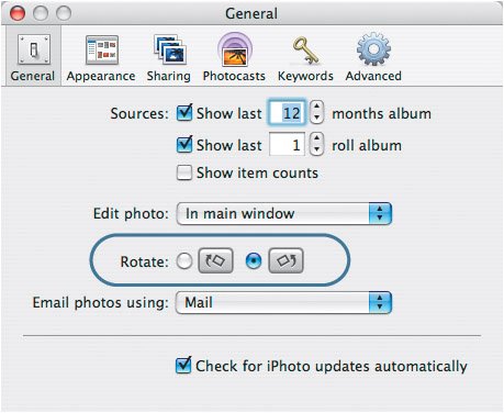 If you want to change the default direction in which this button rotates photos, go to iPhoto Preferences and change the Rotate option. Most people tend to hold the camera in the vertical position one specific way all the time. You'll soon see in your own photos whether the default is right for you.