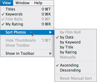 In most albums, the photos appear in the order in which they were dragged in and can be reordered. In Smart Albums, you can't move individual photos around, though you can reorder images by changing how they're sorted. Select the Smart Album, then choose View > Sort Photos.