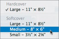 When you click the Book button, a theme window pops up from which you select the book format (hardcover or softcover) and size (small, medium, or large), and then choose from a series of themes appropriate for that format.