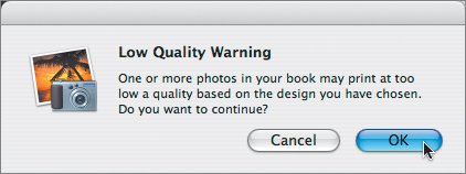 iPhoto is always looking at the resolution of your images and determining if photos of a given quality will reproduce well in the book at their selected size. If it finds a quality problem, it will insert a small yellow caution sign (with an exclamation point in it) over the problem picture, alerting you that the image will not look good when printed. In the case of the red mug, the problem is displaying a low-resolution image at a large size in the book.