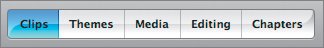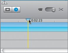 The Timeline Viewer button (above) and the same workspace shown in Timeline view (below). You can still see the clips, but the duration of each is represented by the size of the box. In this graphical view, it's easy to see how long a shot will play, or where you are watching within a given shotboth key aspects of moving images versus still ones. In Timeline view is a vertical line called the playhead, which shows the frame in your sequence that you are seeing in the Viewer.  A good way to play your sequence is to drag the playhead to the beginning of your project and click the Play button below the Viewer.  For many projects, the video camera is your primary source for material. In this lesson, however, since you're not working with video, you'll access all your raw material via the row of buttons beneath the Clip pane. These are particularly important for accessing raw material from the other iLife applications as well as for providing key tools in the construction of your video. |