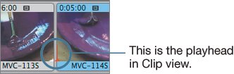 The Clip Viewer button (above) and the workspace presented in Clip view (below). This view gives you a good way to visualize the pieces of your project as you assemble them. It also notes the name and duration of each clip.