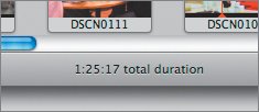 iMovie always tells you the total length of your video (called the total running time in professional circles and total duration in iMovie). At this point in your reedit, the running time of the sequence should be around 1:25, give or take. It's displayed below the timeline or clip workspace, at the bottom center of the iMovie window.