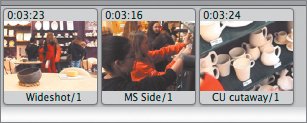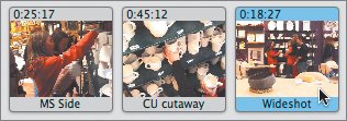 In Clip view, the three shots look like this. Watch them in the Viewer.