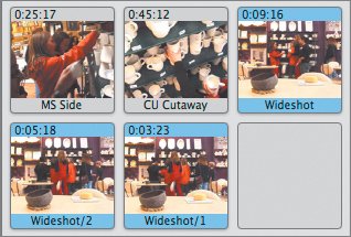Notice what happens in the Clip pane when you use Command-T before you've added the shot to your workspace: The original clip is split into two pieces, and both remain in the Clip pane (and are highlighted in blue). The first segment has the original name; the second has the original name with an appended 1, so that it reads Wideshot/1.