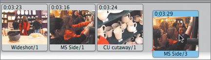 | What becomes apparent is that the opening shot must be much longer than the others. Whether close-up or wide or medium, it needs to play long enough for the viewers to settle in, get some kind of orientation for themselves, and be able to look around at what is happening. A few seconds (even 3) isn't enough for this; 5 seconds is more appropriate. Modifying Shots in Your Timeline For much of your editing work, you will alternate between the Clip view and the Timeline view of your sequence. Moving shots around is easy in both Clip view and Timeline view; seeing relative lengths and playing from some spot in the middle of the sequence is easier in Timeline view. You can modify shots only from within Timeline view. When you're in this view, your pointer turns into a special (and powerful) trimming tool that allows you to adjust where shots begin and end, even after they're in the timeline. The Trim tool lets you not only shorten shots, but also lengthen them. In the present configuration of shots (medium, close-up, medium, close-up, wide) Christopher wants to make the first shotthe medium shotlonger. Clip view says it's 3 seconds, 2 frames long. The timeline shows it to be roughly the same length as the others. The timeline isn't as pretty a view of your work, but it's exceptionally functional. Tip If you want to see your whole sequence but can't, don't forget that you can use the Zoom slider to change the scale of the timeline. When it's all the way to the left, you will see your entire sequence, regardless of how long it is or how many clips you have. If you need to zoom in closer in order to work, use the scroll bar along the bottom of the timeline. Note You may be interested to learn that Timeline view is the only view that professionals use when working in Final Cut Pro and Final Cut Express. 1. | Select the first shot.