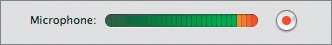 If a sound is too loud, the bar of lights will reach the yellow and then the red zone. You want the sound to be loud enough, but not too loud. For most speech it's safest to stay in the middle of the green zone, with an occasional peak in the yellow or even red, as long as it's kept to a minimum.