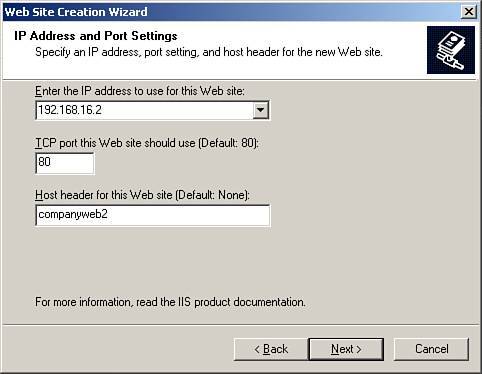 Figure 14.9. The Web Site Creation Wizard IP Address and Port Settings page.  | 6. | Enter the host header value for your new website and click Next. The host header value should match the URL you want to use to access the new site. Figure 14.9 shows companyweb2 as a host header value. As a result, you would enter http://companyweb2 into your browser to access this site.
