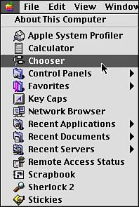 Figure 17.7. The Chooser application can be easily found in the Apple menu under Mac OS 9.  | 3. | Classic mode starts up if not already running (Mac OS X only).