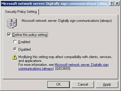 Figure 17.9. The security policy setting needs to be disabled to allow SMB access from the Macintosh.  | 16. | Click OK.