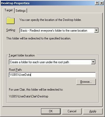 | 6. | On the Folder Redirection screen right-click on Desktop and select Properties (see Figure 21.2). On the Setting drop-down box, select Basic and make sure that you select Create a Folder for Each User Under the Root Path; then type \\SBS\UserData on the Root Path box. Look carefully at the bottom so that you can see whether the proposed file structure matches what you want.