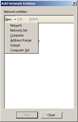 | 4. | On the Access Rules Sources page, click the Add button. A pop-up box called Add Network entities opens. Expand Network and select Internal; then click Close and click Next.