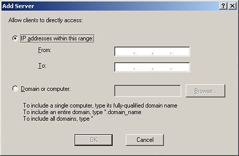 | 4. | In the Directly Access These Servers or Domains box, (see Figure 24.11) you see the Internet IP address of your SBS server. Click the Add button and enter the IP address of the site that you need to directly access in the From and To box; if the support staff has given you a range, enter the beginning of the range in the From box and the end of the range in the To box. The support staff should be able to give you this information. If all you have available is the URL for the site, select the Domain or Computer radio button and click Browse, or enter the URL. Click OK to finish and click Apply.