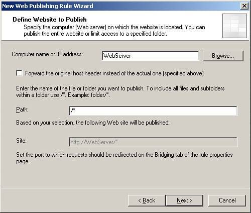 | 2. | The wizard has already selected Allow on this page, so click Next. In the Computer Name or IP Address box, enter the full name of the web server or its IP address. In the Path box enter /* if this is the only website on your server; otherwise, enter /folder name where folder name is the name of the folder that contains your website as shown in Figure 24.15. Click Next.