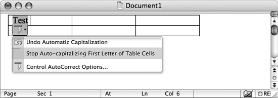 It's hard to see how Microsoft could claim that this omission of a user interface control is a feature rather than a faultbut fortunately, there's a fix. Insert a table, type a word starting with a lowercase letter in one of the cells, and press the spacebar to trigger the AutoCorrect action. Click the AutoCorrect Smart Tag, and choose "Stop Auto-capitalizing First Letter of Table Cells" from the menu (see Figure 10-3). A quick warning, though: once you turn off this option, you can never turn it back on.