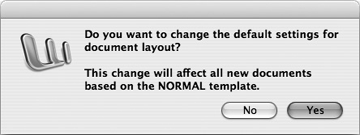 Document; choose the margins, layout, and any other settings that you want as defaults for your documents; click the Default button; and then click the Yes button in the confirmation dialog box (see Figure 10-4).