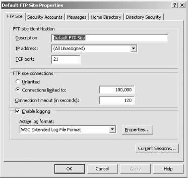 Your site is now created. 8.6.2. Master FTP Site PropertiesNow that we have a site created, let's look at the default properties that can affect all sites on a machine. To access the master properties of all FTP sites, right-click the FTP sites node in the left pane on IIS Manager, and select Properties. You'll be greeted with the screen shown in Figure 8-23. Figure 8-23. IIS FTP master properties![]() Some settings apply only to individual sites and not to all sites of a certain machine, and those options are grayed out. For the most part, all master settings work identically to those settings for individual sites, only their scope is broader. In fact, configuring a setting inside the master properties means all sites on the machine will inherit that setting except those that already have a value explicitly definedin other words, no existing configurations will be overwritten. The exception to this is the Service tab, on which you can throttle the bandwidth that all FTP sites use in total. This can be an effective way of restricting an FTP site from overtaking the total throughput of a leased line. You set the throttle based on KB per second. You can't set throttles on individual FTP sites; the option is available per machine only. 8.6.3. Individual FTP Site PropertiesTo open the properties sheets for an individual web site, select that site with IIS Manager under the FTP Sites node in the left pane. Right-click the site listing and select Properties. You'll see something similar to Figure 8-24 on your screen. Figure 8-24. Individual FTP site properties![]() In this section, much like the discussion on web site properties, I'll step through each tab and show you the meaning of each setting. 8.6.3.1 FTP SiteFigure 8-25 shows the FTP Site tab. Figure 8-25. The FTP Site tab![]() On the FTP Site tab, you can specify the identification information for your site, including the friendly description, its assigned IP address if in use, and the port number on which the site operates. In addition, you can choose to limit connections to a certain number and end connections forcibly that don't generate activity for a certain number of seconds. Here, you also can enable logging, and choose the log format that best suits your needs. (I discussed these in the web site properties section earlier in this chapter.) The Current Sessions button enables you to view who is currently connected to your FTP site, their login context if any, their source IP address, and how long their connection has been active. You also can click an active connection and disconnect it manually using the Disconnect button, or use Disconnect All to completely clear connections to your site. 8.6.3.2 Security AccountsFigure 8-26 shows the Security Accounts tab. Figure 8-26. The Security Accounts tab![]() On the Security Accounts tab, you can enable or disable anonymous access to your site and define what user account anonymous users will use when accessing your FTP site. Much like with the web server, anonymous users are actually logged on to your machine in the context of a specific user on your system or in Active Directory. This makes it easier to lock down filesystem content from external users and provides another layer of securitythe NTFS permission systemon top of the basic IIS permissions available.