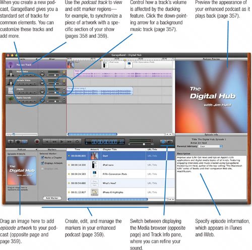 | I've already described how you can use iTunes and your iPod to listen to podcasts of all kinds (pages 3637). With GarageBand 3, you can go from listener to producer. GarageBand 3 turns your Mac into a radio studiowith broadcast engineer. Connect a microphone to your Mac or use the built-in mike that some Macs provide. You can also use the microphone built into Apple's iSight video camera. GarageBand 3 contains audio filters that optimize the sound produced by an iSight or built-in Mac mike. Record your rants, vacation dispatches, family interviewswhatever you like. You can even record remote interviews with iChat users. Your audio is recorded into real-instrument tracks, so you can edit it using the same techniques described earlier. Need theme music? Compose your own or use one of the many royalty-free music jingles included with iLife '06. Use the ducking feature to have GarageBand automatically lower and raise the music volume when you start and stop talkingjust like the radio. But don't stop there. Consider creating an enhanced podcast. Add chapter markers that enable listeners to conveniently jump around through your show. Add artwork that appears during playback in iTunes and on any iPod that can display photos. And add Web URLs that let iTunes users jump to specific Web pages as your show plays. When you're finished, send your completed production to iWeb for publishing on the Internet. Here's how to become a podcaster. Pick a Background Use the loop browser to explore and choose from more than 100 jingles, including many sets that provide the same song in lengths of 7, 15, and 30 seconds. You can also choose from hundreds of sound effects and music stingersand even use the Musical Typing window to play them as you do your show (page 333). Add Visuals Use the media browser to add photos (page 358) or movies (page 362). Use the search box to quickly locate what you need. Add Web Connections Want your listeners to be able to jump to Web pages that relate to your subject? Add Web addresses (URLs) to your markers (page 359). |