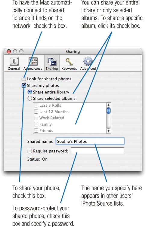| If you have more than one Mac on a network, you can share each Mac's photo library and make it accessible to the other Macs on the network. Network photo sharing leads to all kinds of possibilities. Keep your "master" photo library on one Mac, and then access it from other Macs when you need to no need to copy the library from one Mac to another and worry about which library is the most current. Don't like centralization? Embrace anarchy: let everyone in the family have his or her own photo library, and then use sharing to make the libraries available to others. Have an AirPort-equipped laptop Mac? Sit on the sofa (or at poolside) and show your photos to friends and family. Or take your laptop to their house and browse their libraries. Network sharing, a laptop Mac, and AirPort form the ultimate portable slide projector. You can choose to share an entire photo library or only some albums. And you can require a password to keep your kids (or your parents) out of your library. Activating Sharing To share your photo library with other Macs on a network, choose Preferences from the iPhoto menu, then click the Sharing button. Accessing Shared Photos To access shared photos, choose Preferences from the iPhoto menu, click the Sharing button, and be sure the Look for Shared Photos box is checked. iPhoto scans your network and, if it finds any shared photo libraries, adds their names to the Source list. To view a shared library, click its name in the Source list.