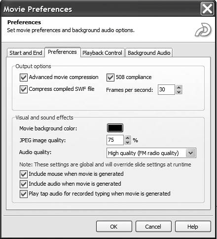 | Captivate's movie preferences are a bit different from those of many Windows applications you may use. In Captivate, the preferences are applied only to the currently opened movie, not the application. For example, suppose you decide to change the background of all of the slides in your movie from white to black. You do this by selecting Movie > Preferences and selecting Black in the Movie background area (Figure 1.8). In a lot of applications, this will result in all slides created having a black background. Yet in Captivate, that black background is applied only to the currently open movie. You can also make a stop at the Preferences dialog box before you publish the movie. With the Publish dialog box open, click the Preferences button to launch the Preferences dialog box. Figure 1.8. The Movie Preferences are applied only to the movie that is open.