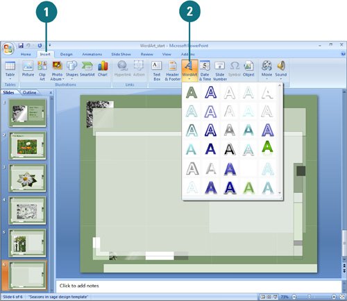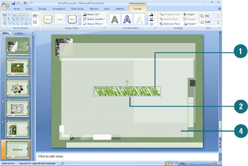 |  PP07S-2.2.7 The WordArt feature lets you create stylized text to draw attention to your most important words. Most users apply WordArt to short phrases or even just a word, such as GROWING A GARDEN. You should apply WordArt to a slide sparingly. Its visual appeal and unique look require uncluttered space. When you use WordArt, you can choose from a variety of text styles that come with the WordArt Quick Style gallery (New!), or you can create your own using tools in the WordArt Styles group. To quickly see if you like a WordArt Quick Style, point to a thumbnail in the gallery to display a live preview (New!) of it in the selected text. If you like it, you can apply it. You can also use the free angle handle (pink diamond) inside the selected text box to adjust your WordArt text angle. Insert WordArt Text