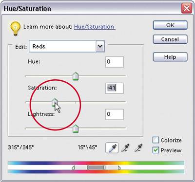 The rest is easyyou're simply going to reduce the amount of saturation so the flesh tones appear more natural. Drag the Saturation slider to the left to reduce the amount of red. With the Preview checkbox turned on, you'll be able to see the effect of removing the red as you lower the Saturation slider.