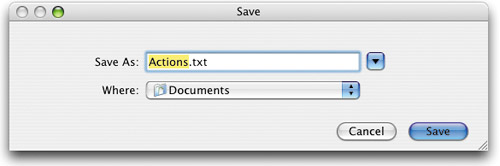 | This is a totally undocumented actions tip, and if you need it, it's a real lifesaver. Once you've created an action, you can actually save a text document with all the action steps so you can have a printed hard copy of your action. Here's how: In the Actions palette, click on the action set containing the action that you want to save as a text document. Hold Command-Option (PC: Control-Alt) and from the Actions palette's flyout menu, choose Save Actions. When the Save dialog appears, you'll notice that the three-letter file extension is TXT (indicating it's a text file) rather than ATN (which is the Photoshop action format). Click OK and you've got a text file you can open in any word processor to print out your steps.