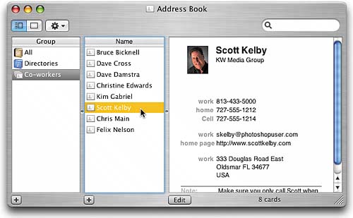 | Now you just scroll through the Names column (by clicking-and-dragging the little blue pill-shaped button up and down) until you find the name of a co-worker. When you find a co-worker's name in the list, click-and-drag it to the Co-workers group that we created in the Group column, then release your mouse button.